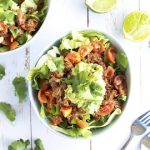 Assemble your burrito bowls with a layer of quinoa/brown rice and top with shredded lettuce. Add beef and top with salsa and guacamole.